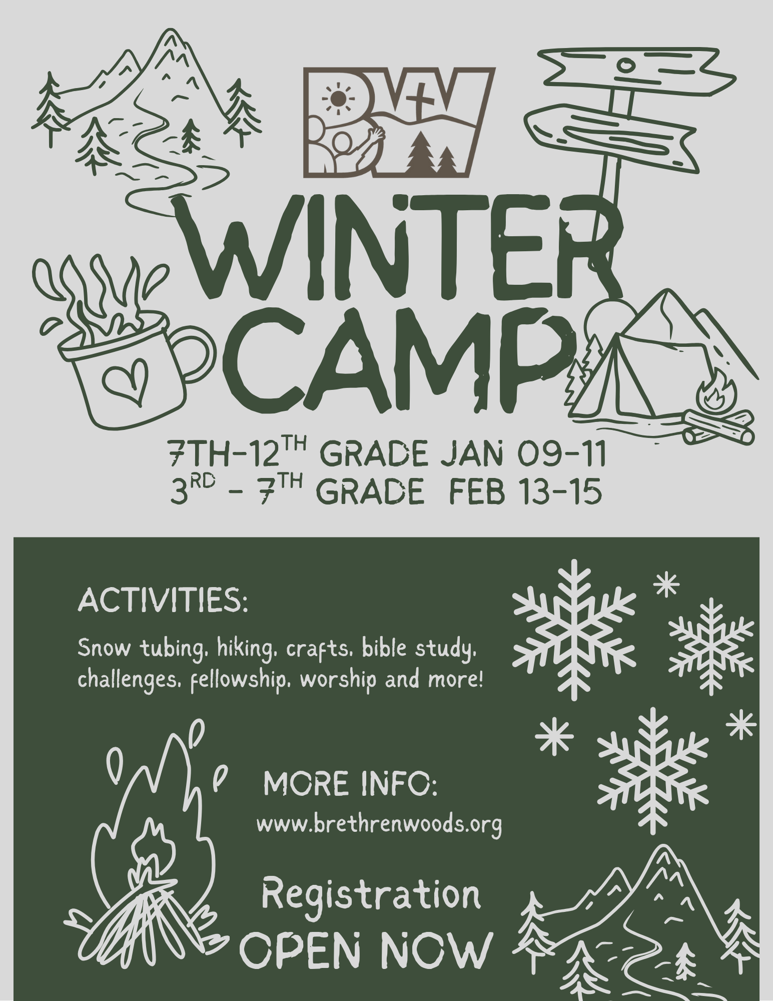 Our time together begins at 6:00pm on Friday, January 9th and ends at 2:00pm on Sunday, January 11th.  Registration cost includes lodging, meals and snacks, snow-tubing, a group photo and apparel item, staff leadership, and all retreat supplies!